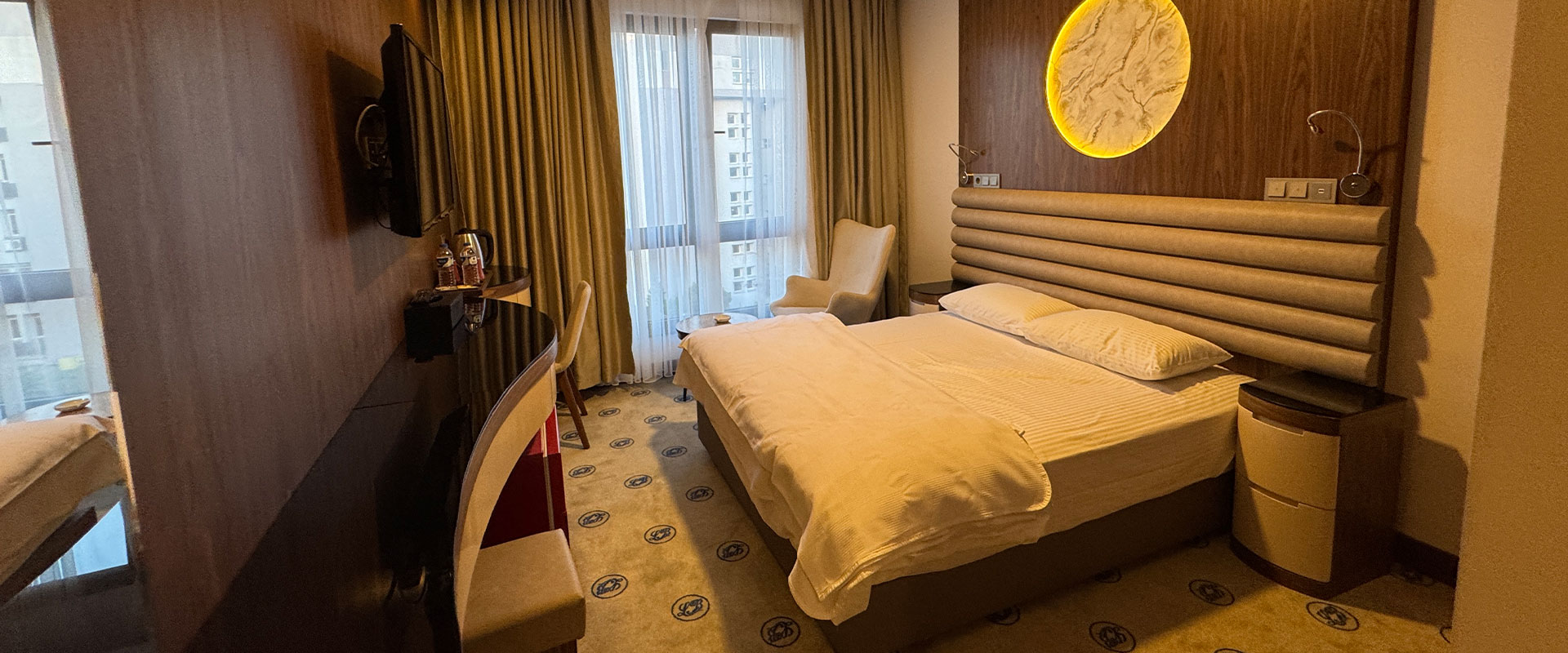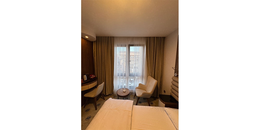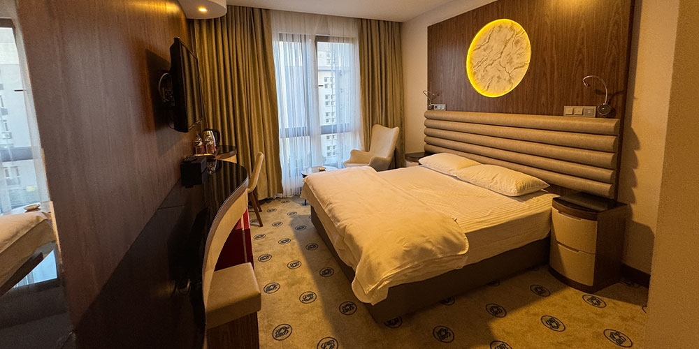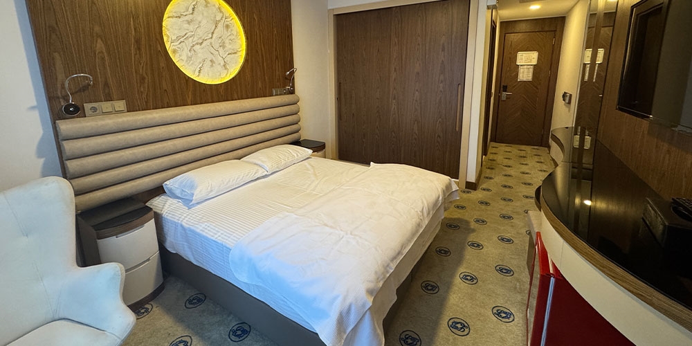 Toplam 25 m² genişliğe sahip çift kişilik odalarımız, iki kişilik konaklamalar için ideal şekilde tasarlanmıştır. Modern çizgilere sahip dekorasyonu ve kullanışlı alan planlamasıyla misafirlerimize hem iş seyahatlerinde hem de tatil amaçlı ziyaretlerde keyifli bir deneyim sunar.